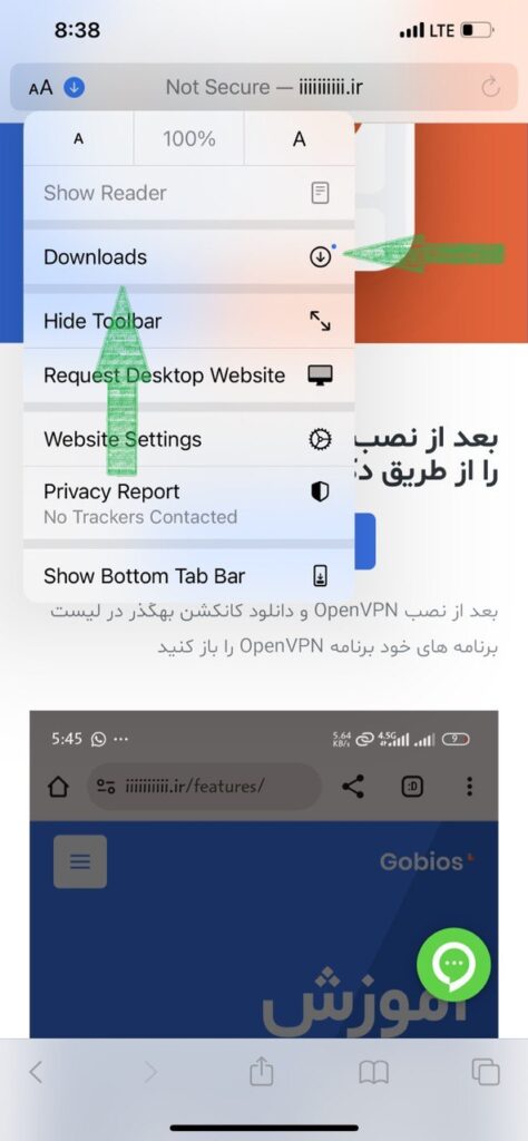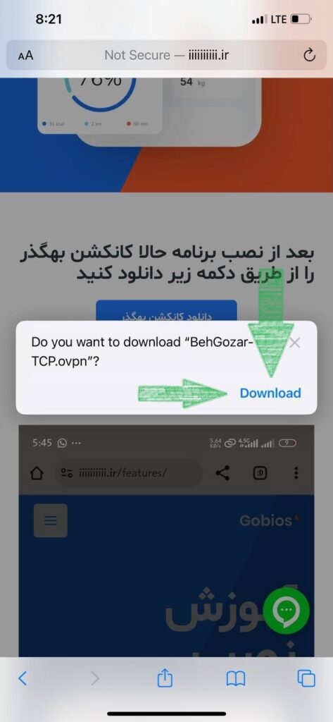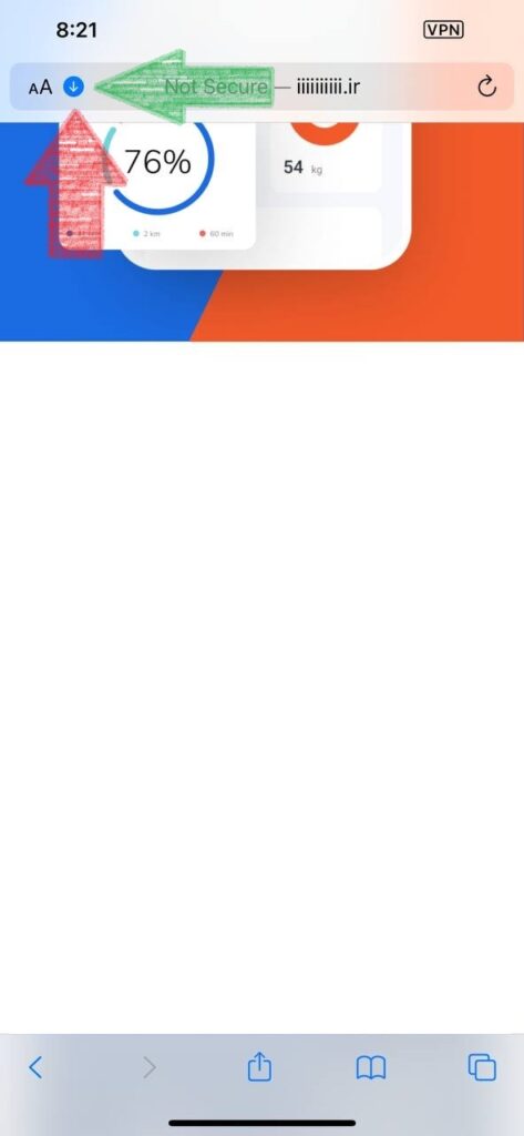 بعد از دانلود شدن کانکشن و زدن دکمه download بر ری اکون آبی رنگ بالای صفحه سافاری کلیک کنید ( همانند تصویر زیر)