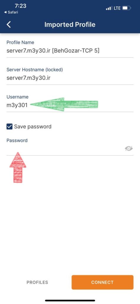 در این مرحله در کادر username نام کاریری خود را وارد کنید و بعد از فعال کردن دکمه Save password در کادر مربوطه کلمه عبور خود را وارد کنید و برروی دکمه Connect پایین صفحه کلیک کنید